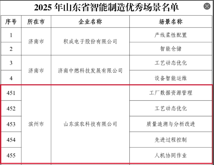 近日,山東省工業(yè)和信息化廳公布了2025年先進級(省級)智能工廠和智能制造優(yōu)秀場景培育認定名單,濱農(nóng)科技獲評2025年山東省先進級(省級)智能工廠,其中工廠數(shù)據(jù)資源管理、工藝動態(tài)優(yōu)化、質量追溯與分析改進、先進過程控制、人機協(xié)同作業(yè)獲評2025年山東省智能制造優(yōu)秀場景。