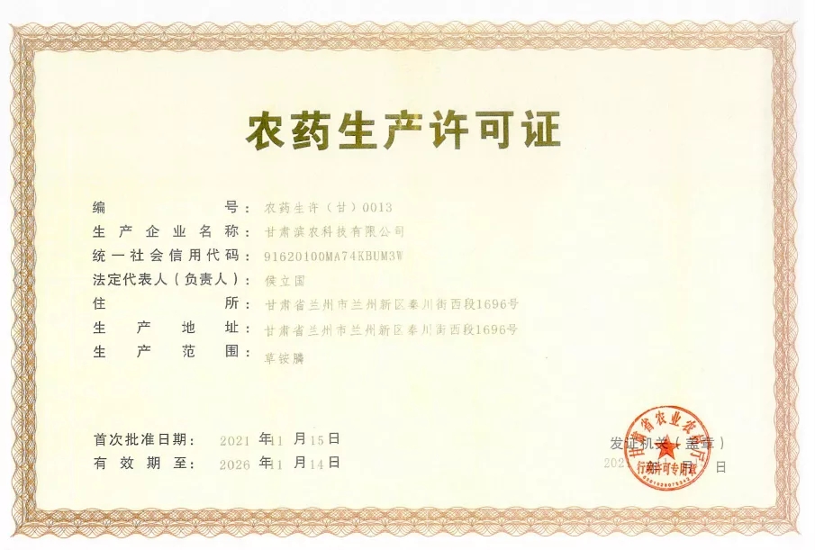 最終,甘肅濱農(nóng)順利通過草銨膦原藥農(nóng)藥生產(chǎn)許可審查并取得農(nóng)藥生產(chǎn)許可證(證號為農(nóng)藥生許(甘)0013),進一步夯實了公司生產(chǎn)基礎,為濱農(nóng)戰(zhàn)略發(fā)展再添強勁動力。