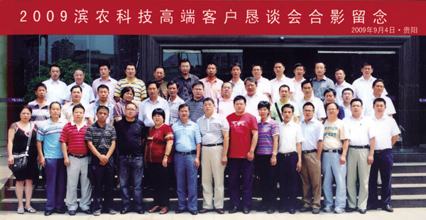 時間:2012-08-10 14:56秋高氣爽,天氣宜人,2009年9月4日至6日,濱農科技董事長黃延昌率銷售公司代表一行人員,與來自全國各地的32位高端客戶相聚在山清水秀的貴陽市,就濱農目前存在的問題及未來發(fā)展瓶頸進行了廣泛而有益的交流,會議取得了圓滿成功。