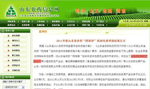 2012年1月6日,山東省農(nóng)藥檢定所主辦的2011年度山東省農(nóng)藥“四培育”活動先進(jìn)單位和優(yōu)秀產(chǎn)品評選結(jié)果出爐:濱農(nóng)科技獲得十強(qiáng)農(nóng)藥生產(chǎn)企業(yè)第一名的榮譽(yù)稱號。這是我公司繼2010年度獲得第一名之后再次蟬聯(lián)這一稱號。