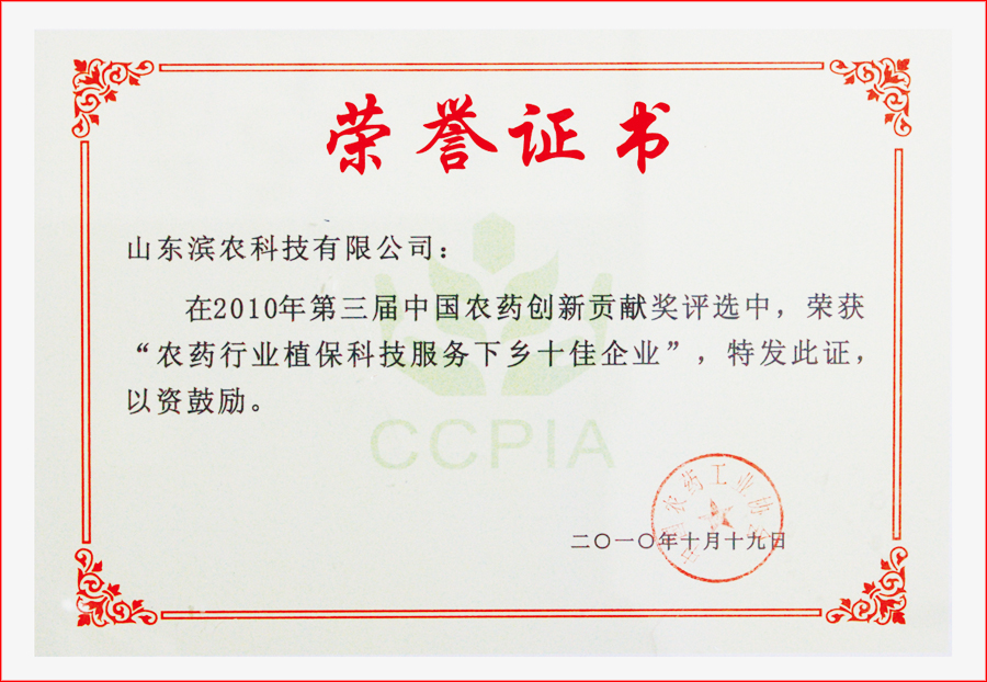 時間:2012-08-10 14:56 2010年10月20日,在上海召開的第十屆全國農(nóng)藥交流會開幕式上,第三屆“中國農(nóng)藥行業(yè)創(chuàng)新貢獻(xiàn)獎”評選結(jié)果揭曉,我公司榮獲“中國農(nóng)藥行業(yè)植?萍挤⻊(wù)下鄉(xiāng)十佳企業(yè)”稱號,董事長黃延昌出席頒獎儀式。
