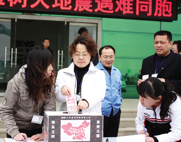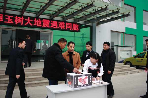 4·14青海玉樹(shù)地震發(fā)生后,我公司全體干部員工十分關(guān)注來(lái)自災(zāi)區(qū)的一切消息。4月21日上午10時(shí),值此全國(guó)哀悼日,我公司黨總支、工會(huì)組織了“情系玉樹(shù),真愛(ài)無(wú)疆”自愿捐款活動(dòng),集團(tuán)董事長(zhǎng)黃延昌、總經(jīng)理任立明率先捐款,全體高中層干部在辦公樓前參加了集體捐款活動(dòng)。集團(tuán)公司各部門(mén)、車間員工也紛紛自發(fā)捐款,集中將善款交到了企業(yè)文化部;顒(dòng)結(jié)束后,累計(jì)捐款近五萬(wàn)元,這批善款將用于馳援災(zāi)區(qū)同胞抗震救災(zāi),重建家園。